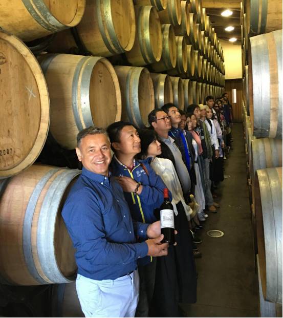 歐其諾考察團(tuán)到達(dá)格拉夫-吉尼亞酒莊(捧著酒的是莊主布魯諾先生)