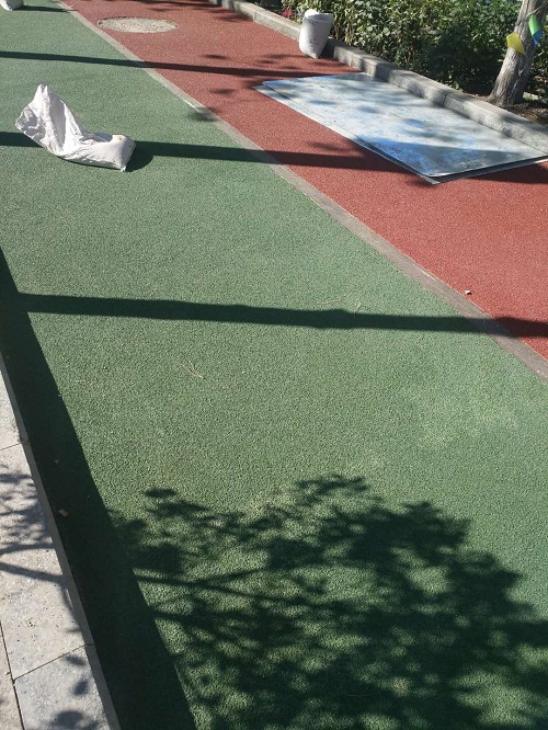 用粉筆圈出填補范圍,用路面涂料填補后刮平(用小刮刀)。(六)自行車道防滑紋施工1、使用耙子進行施工。2、調整杷子四面高度,與地面保持平行;如果地面凹凸不平,可在杷子上蹲人,增加重量。3、在涂料里面加入細骨料(骨料加入量為20%,骨料直徑為0.8-1.5mm)進行攪拌,攪拌均勻后加入1%-2%的固化劑進行攪拌,攪拌均勻后直接涂敷在地面上用耙子進行刮耙。